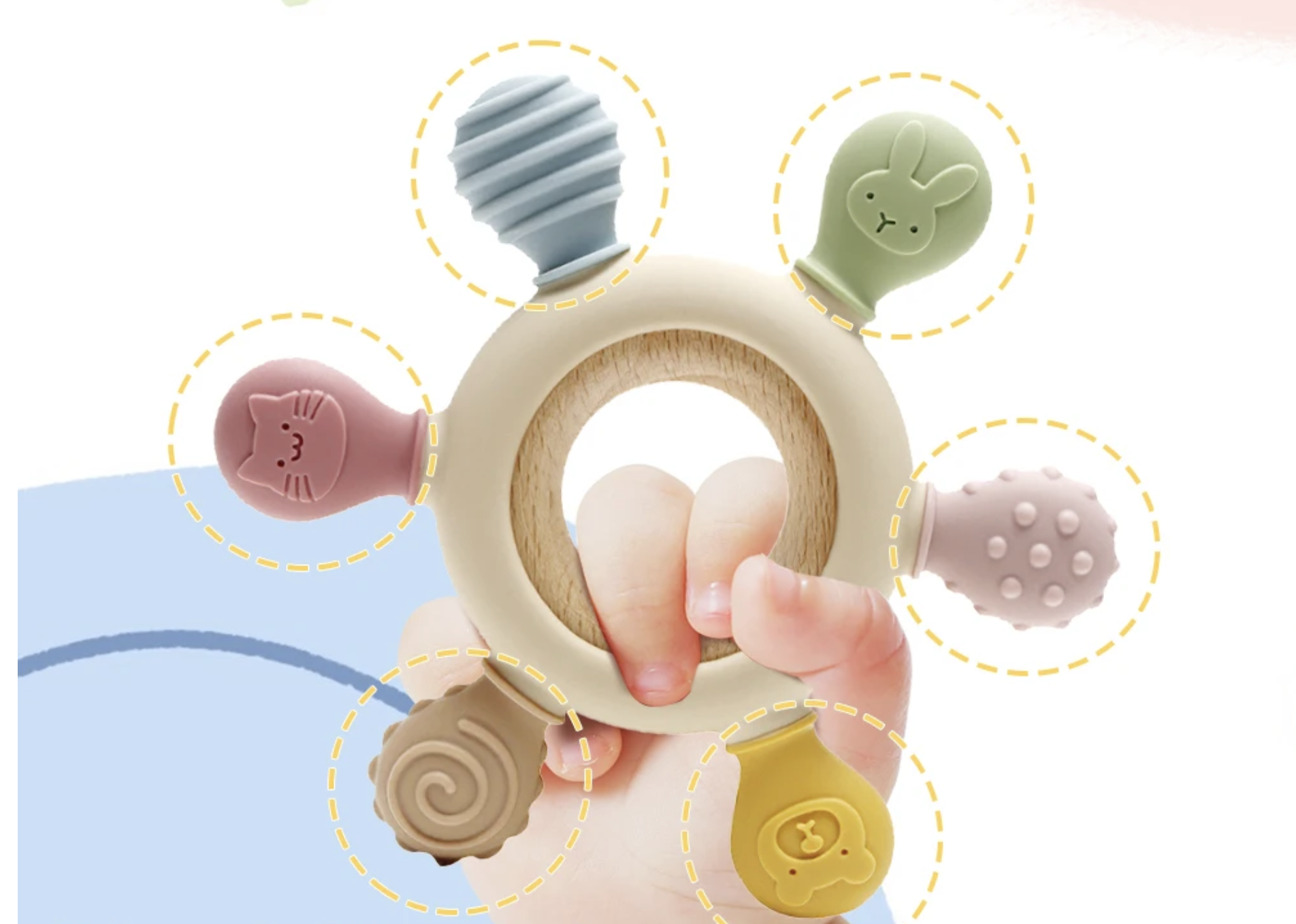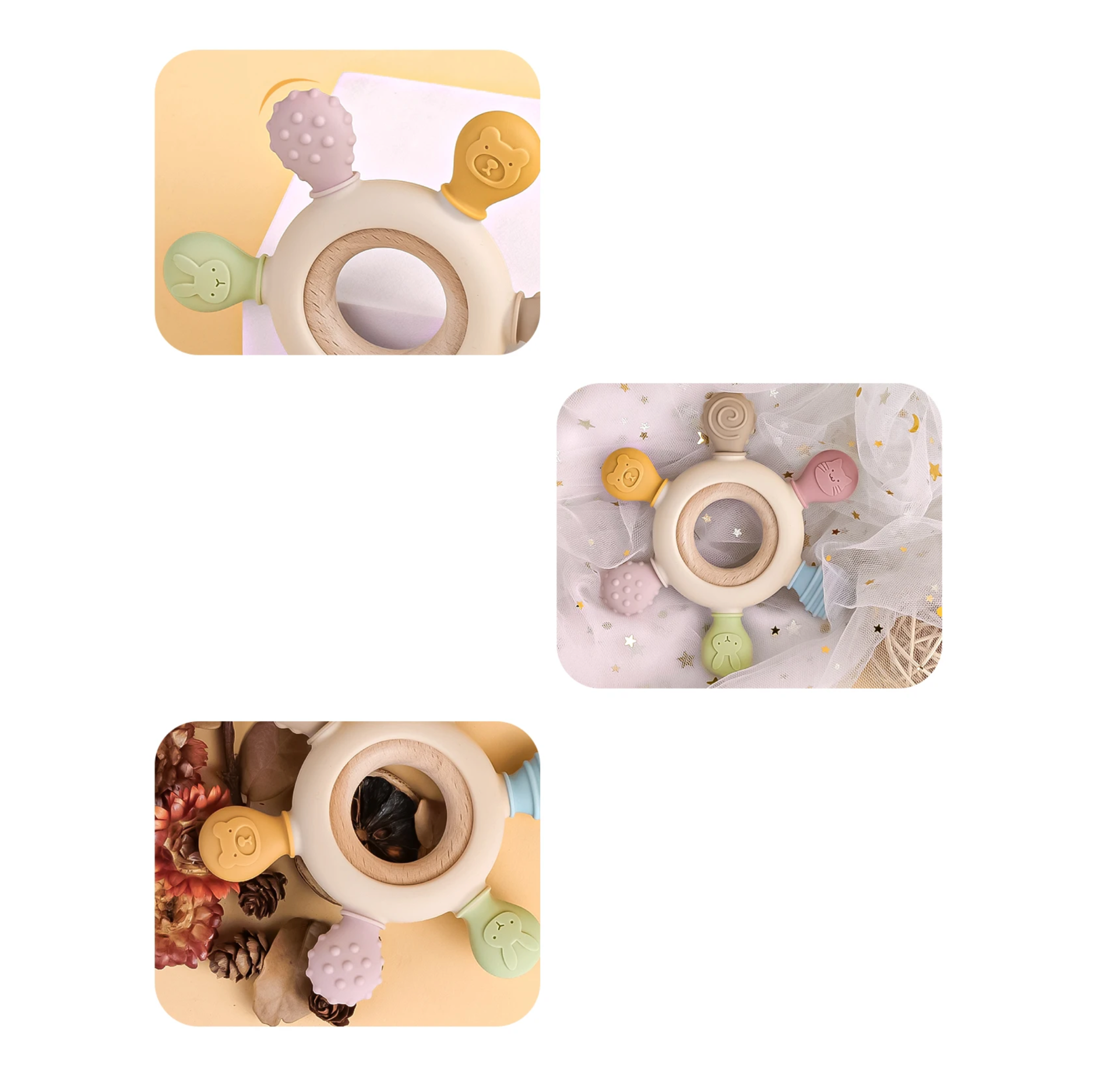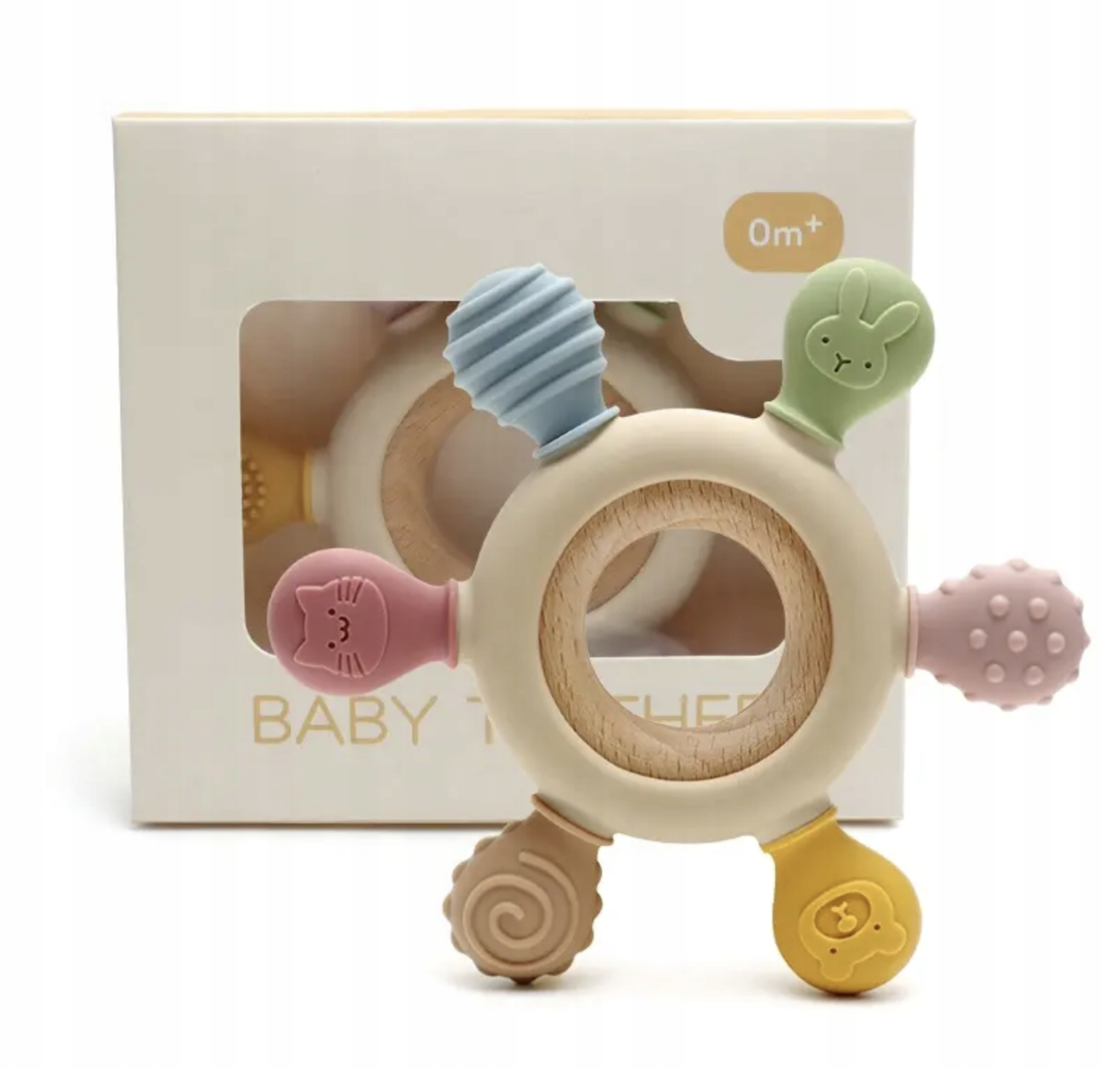 - Natychmiastowa Ulga i Bogactwo Tekstur: Specjalnie zaprojektowane, zróżnicowane tekstury drewna i elastycznego silikonu zapewniają kompleksowe ukojenie. Różne twardości i powierzchnie idealnie masują swędzące dziąsła, przynosząc dziecku błyskawiczną ulgę i komfort. To więcej niż zwykły **gryzak dla niemowląt** – to kojące doświadczenie.